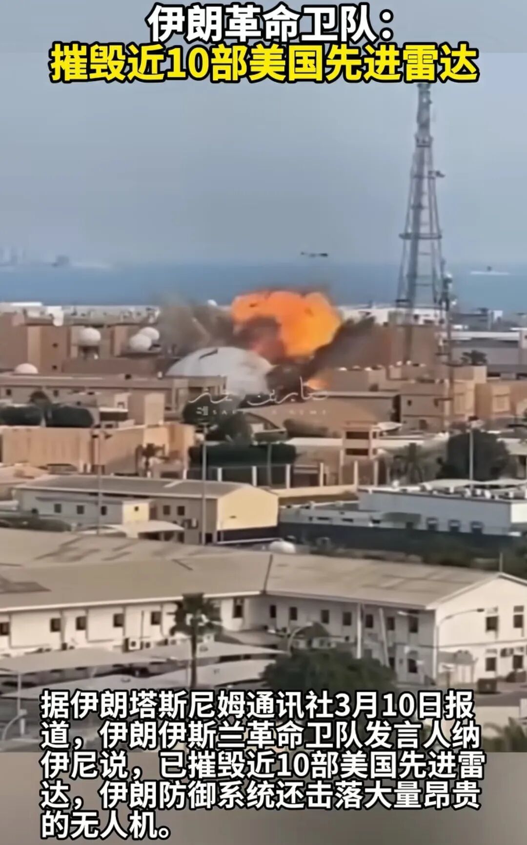 3月10日,伊朗革命卫队发言人纳伊尼也证实了一个消息,看下图,他说“伊朗已经摧毁了美以近10部先进雷达”。